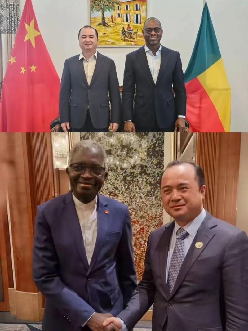 2025年6月3日,金健委在北京为贝宁原驻华全权大使西蒙阁下(下图左)饯行,并召开闭门工作会议,落实贝宁全国大建设协议。次日,贝宁共和国新任驻华大使Franck E. W. Adjagba阁下(上图右)在大使馆会见了金健委北京代表处主任许庆博士一行。双方就深化中国与贝宁多领域合作进行了亲切友好的会谈。