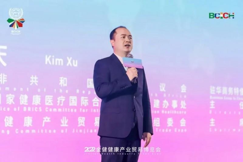 2022年11月,新冠疫情尚未明朗,但在严格落实国家疫情防控措施的前提下,金健委主办的“金砖国家健康产业贸易博览会”如期举行。厦门国际会展中心会场高朋满座,参展企业云集。许庆在台上热情致辞,背后是斯洛文尼亚、埃及等六国使节政要的祝福视频墙。