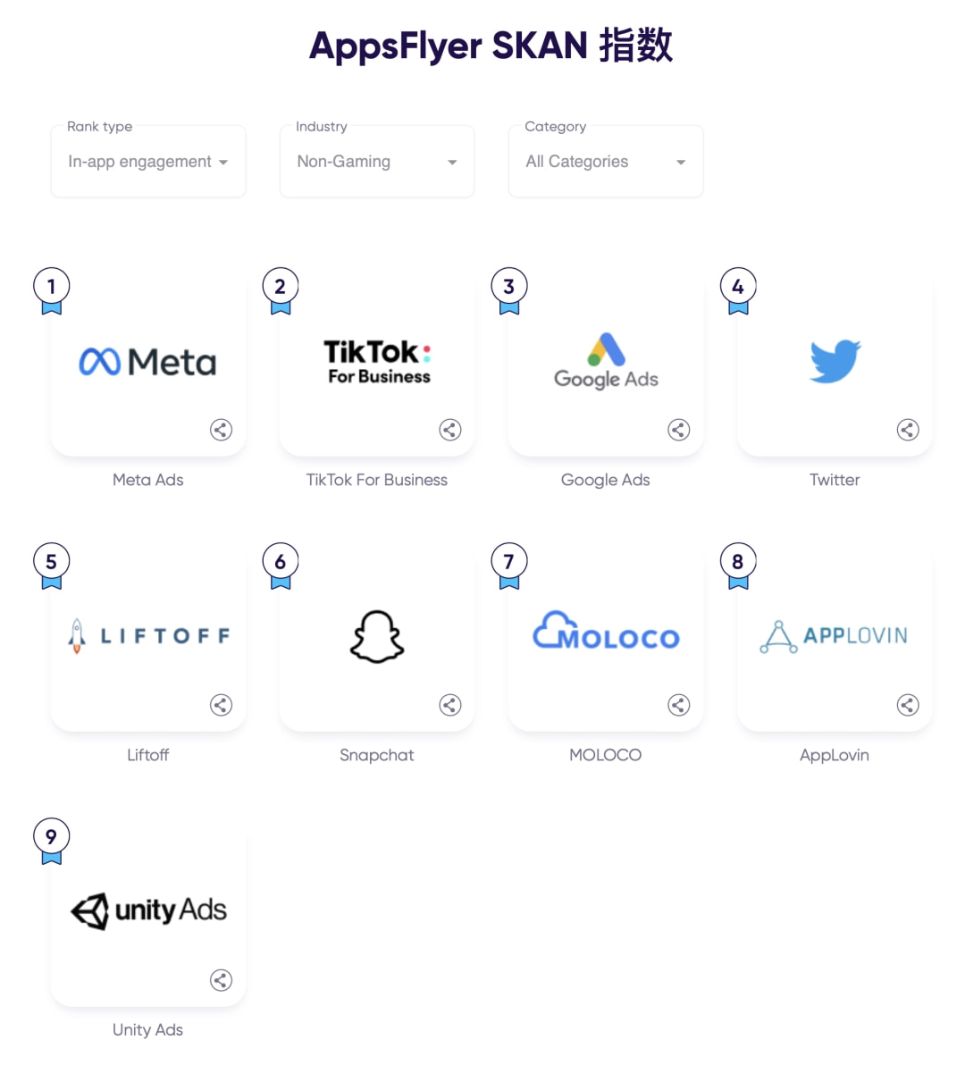 在上一个版本的报告中,Meta失去了在iOS蝉联多年的冠军宝座,但随着Meta的管理层在第一季度推出更多的电商工具,并开始投入资金进行自研追踪技术、转化率衡量技术研究,个性化推荐广告的负面影响得到了一定缓解。加之平台体量本身仍在,因此Meta得以重回SKAN指数榜单的榜首,获得非游戏 IAE、游戏与非游戏 IAP榜单的第一名。