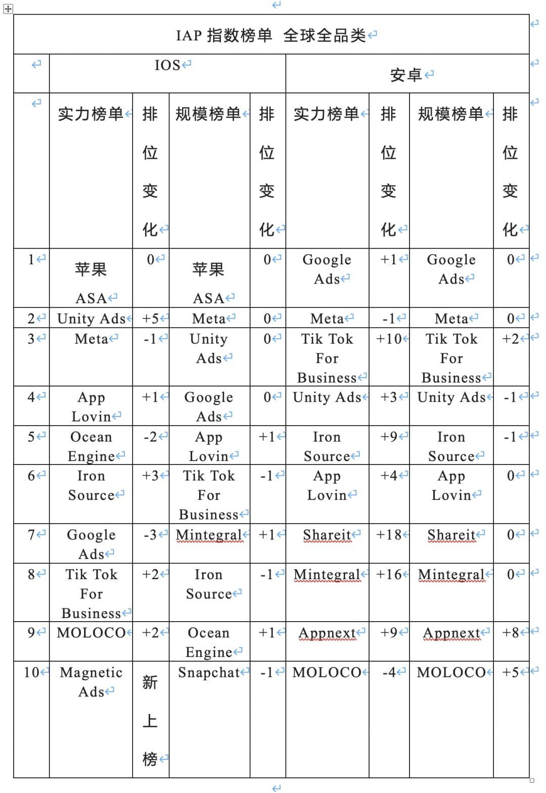 3、 IAP安卓侧全榜单浮动明显,Tik Tok For Business、Mintegral等平台增长突破10位。