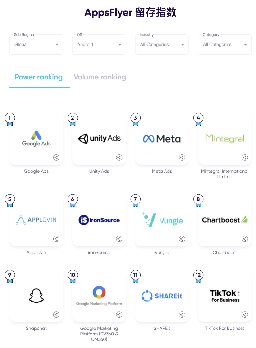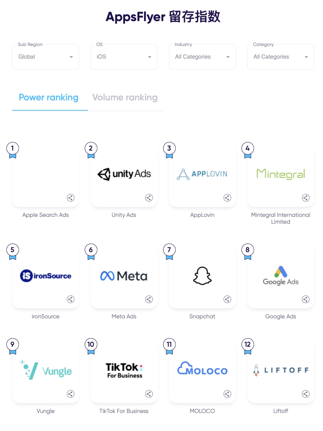 而留存榜中还有一个值得注意的中国出海平台,Mintegral。在双平台全品类留存排名中它都位列第四,是唯一跻身 iOS 及安卓双端榜单前4的中国平台。