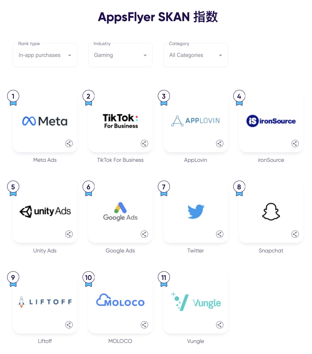 同样上榜的还有AppLovin、Unity Ads,两平台在其擅长的游戏领域表现良好,而社媒Twitter和Snapchat在非游戏方面的数据则更为出色。
