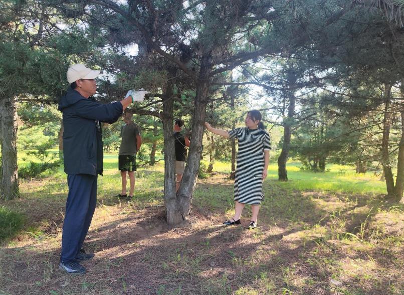 白音花镇镇级林长(右一)正在查看林业有害生物防治情况(李明月摄)
