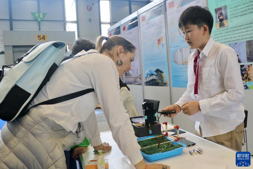 4月26日,在瑞士日内瓦举行的第48届日内瓦国际发明展上,中国小学生冯佳澍(右)在展会上用流利的英语向参观者介绍其作品。年仅11岁的冯佳澍是展会上年龄最小的发明者,他的作品“智慧鸟巢”获得金奖。新华社记者 王其冰 摄