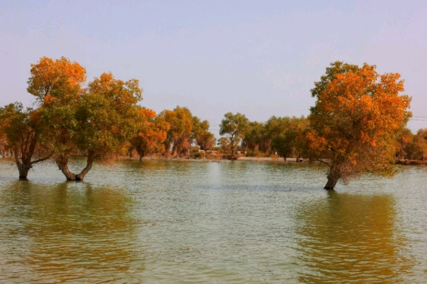 在沙雅县第十四次胡杨文化系列活动新闻发布会周边的胡杨林已显露金黄 程磊 摄