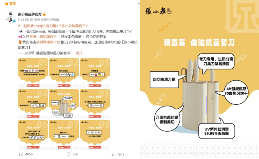 线上营销层面,张小泉在微博平台发起#一眼识破emoji之用刀篇#的定制话题,将刀具使用误区转化为视觉符号谜题,网友们在猜谜的过程中被科普了“生熟不分”“刀架积水”等厨房卫生实用知识点。活动获得13位KOL带头参与解谜,引发大量自来水二次互动讨论,狂揽阅读量超2000万,实现快速破圈。